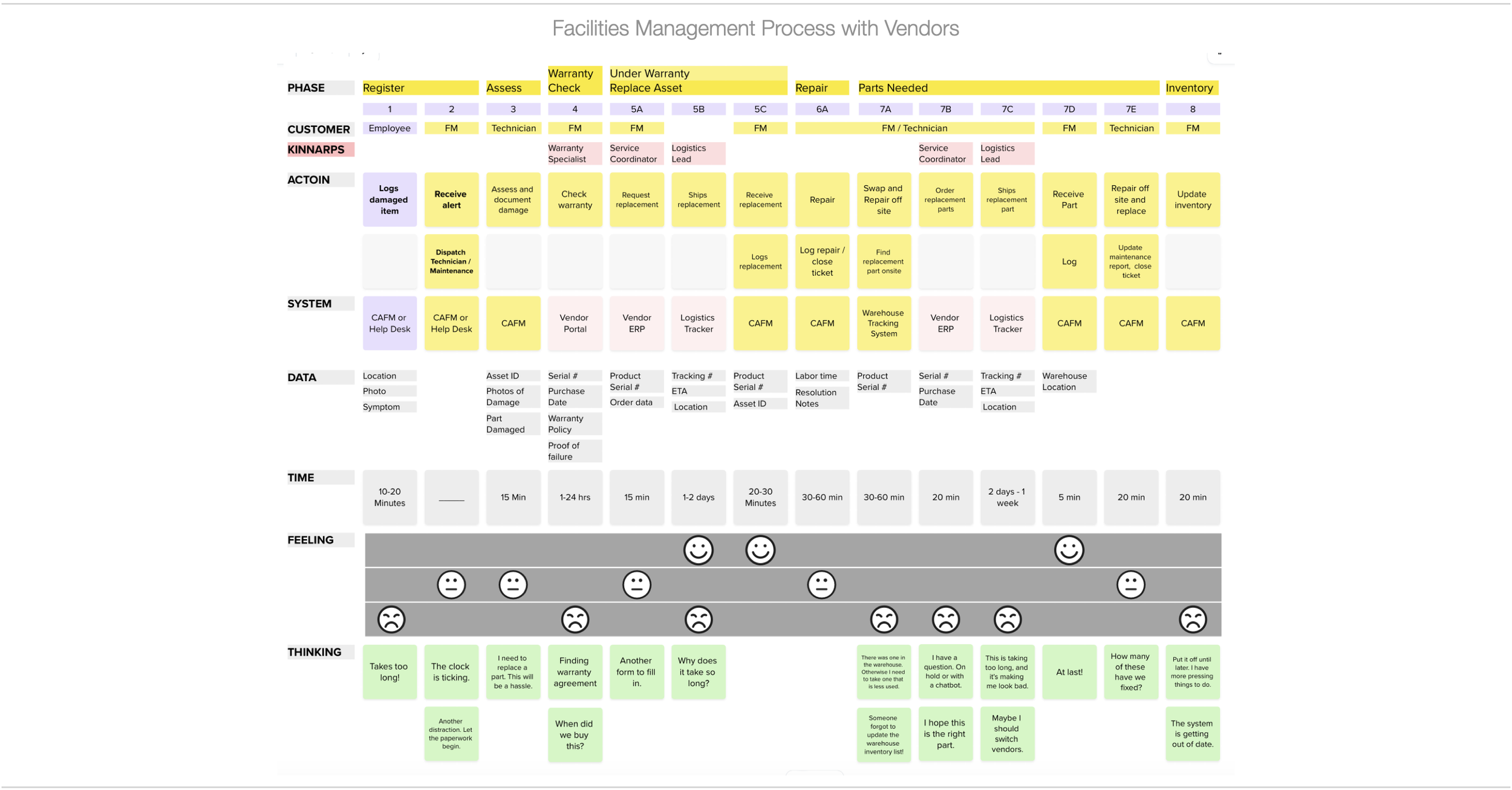 Together with Facilities Managers we mapped the furniture maintenance process from the report of an issue to closing the ticket and updating inventory. In each step we documented vendor touch points, actions, the systems used, key data, duration, and pain-points.