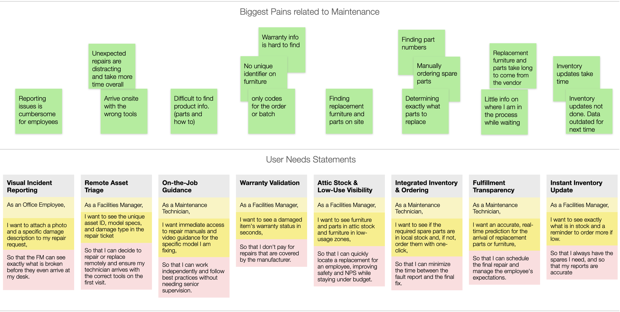 By interviewing facilities managers, we mapped the key stakeholders in an FM’s ecosystem around. To stay aligned on business outcomes, we focused on the key internal stakeholders he is accountable to (highlighted in yellow) and the key people he engages with from our client (highlighted in pink). We captured information for Empathy Maps, but the biggest insights came from considering Jobs to be Done and the success metrics he is measured on. We scoped in on reducing the Mean Time to Repair to achieve maximum impact for FM’s required outcomes. If we solved that, we believed it would impact reducing total cost of ownership, increasing employee satisfaction, improving safety compliance, and optimising maintenance.