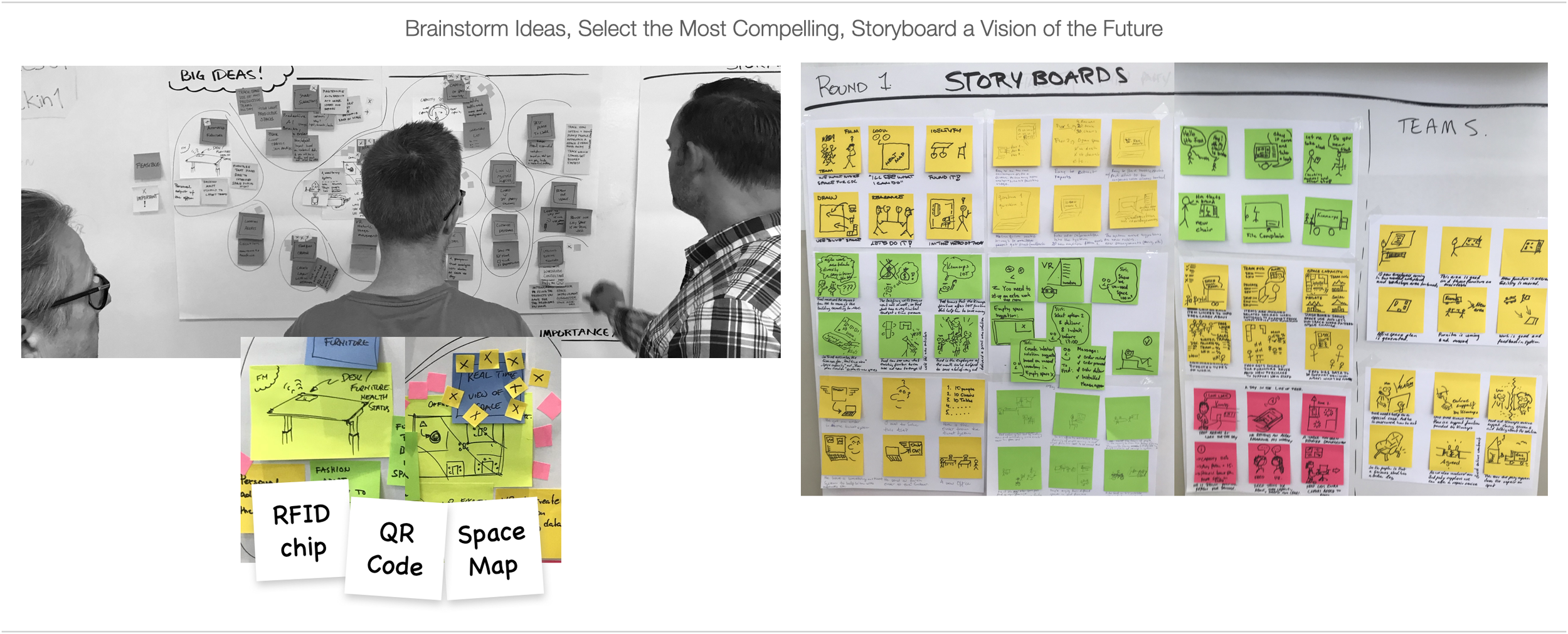 We brainstormed Ideas to address the User Needs and prioritised QR codes on furniture and RFID tags to track location. Each participant wrote a Storyboard to describe the users’ new experience and capabilities.