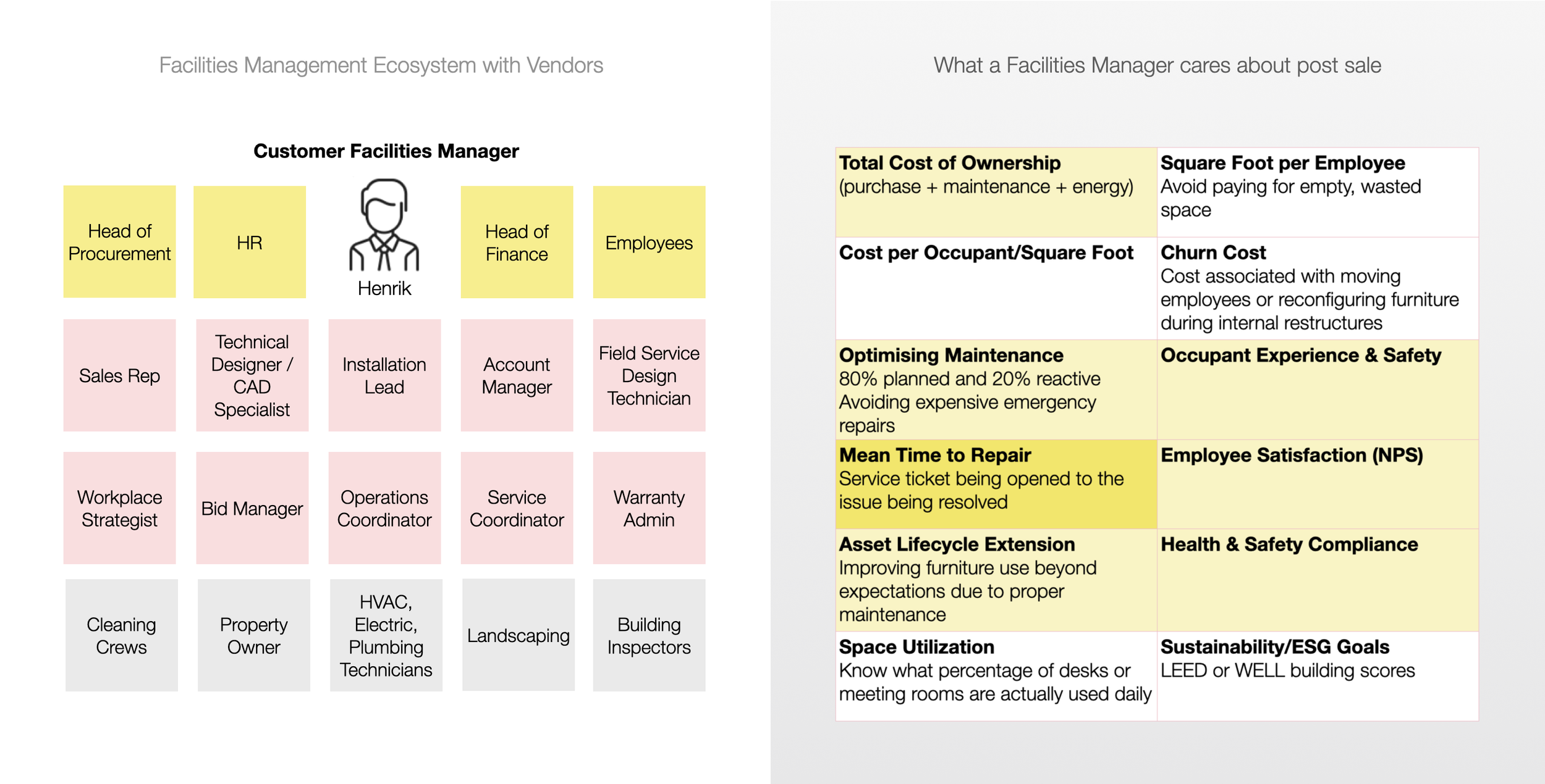 Our client recognised that to stay competitive needed to evolve from a furniture manufacturer into a service partner who could support facilities management from initial installation to final decommissioning. That meant creating a digital tool that could manage inventory, streamline maintenance, and support space reconfiguration over time. To understand the services and solutions our client needed to create, we dove into the complex challenges of facilities managers and their employers.