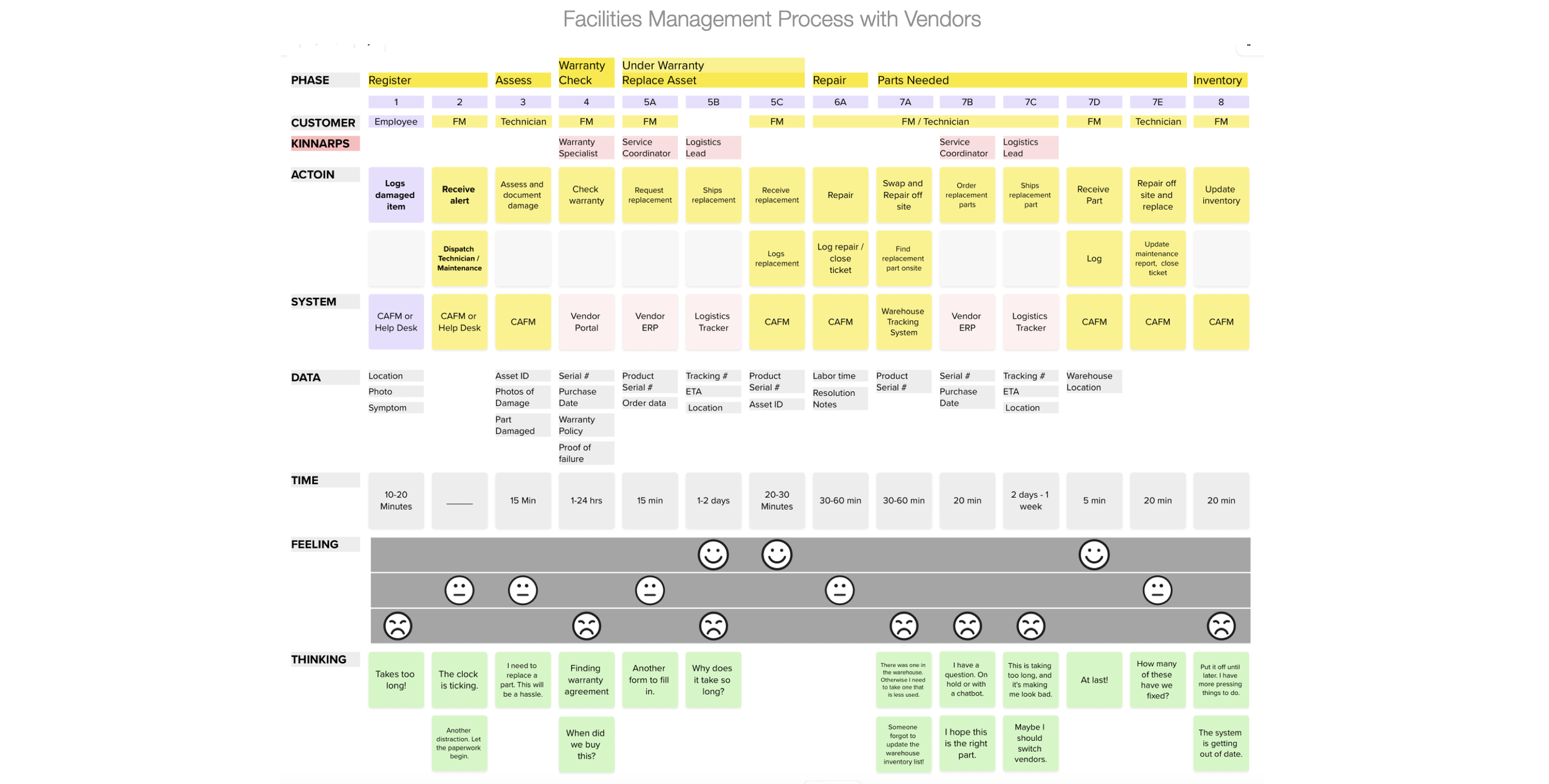 Together with Facilities Managers we mapped the furniture maintenance process from the report of an issue to closing the ticket and updating inventory. In each step we documented vendor touch points, actions, the systems used, key data, duration, and pain-points.